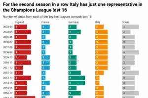 直播吧02月26日讯 TA统计了自03/04赛季以来五大联赛晋级欧冠16强的球队数量。其中,近2个赛季均仅1支意甲球队晋级16强。