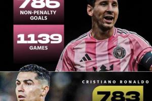 据统计,梅西目前生涯非点球进球数达786球,历史第一。C罗非点球进球数783球第二。