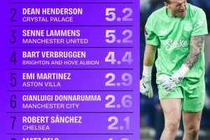 直播吧3月25日讯 在英超赛场上,埃弗顿门将皮克福德有着非常出色的扑救能力。根据Squawka的数据统计,英格兰国门阻止6粒进球为英超门将最多。