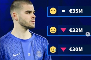 直播吧3月25日讯 德国转会市场晒照,预热巴黎门将舍瓦利耶的身价,四种方案的三种都是身价下调。