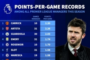 直播吧3月25日讯 德国转会市场统计了本赛季英超主帅的场均积分(至少执教3场),并列出榜单,卡里克2.3分居首,阿尔特塔2.26分次席。