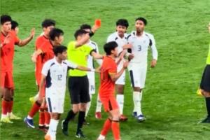 在泰国球员抗议的同时,玄智健过来拉开裁判,并与泰国2号球员差农发生了摩擦,主裁麦麦提江回头便将玄智健罚下。