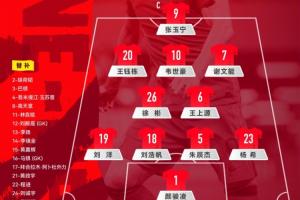 中国队替补:12-刘殿座、16-马镇、2-胡荷韬、3-巴顿、4-吾米提江、8-高天意、11-林良铭、13-李扬、14-李镇全、15-黄嘉辉、17-拜合拉木、21-黄政宇、22-程进、24-刘诚宇、25-蒯纪闻