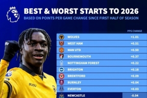 直播吧3月27日讯 德国转会市场统计了2026年英超球队的场均积分,并与球队上半赛季的场均积分比较,列出英超球队场均积分变化排名,狼队+1.01分居首,热刺-1分垫底。