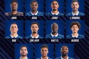 法国首发:1-桑巴、5-卡卢卢、17-拉克鲁瓦、21-卢卡斯·埃尔南德斯、3-迪涅、18-埃梅里、13-坎特、25-阿克利乌舍、24-谢尔基、20-杜埃、9-图拉姆