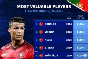 直播吧3月31日讯 德转列葡萄牙球员历史身价榜,C罗2014年1.2亿欧身价最高,维蒂尼亚、若昂·内维斯1.1亿欧并列第二。
