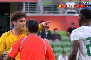 直播吧03月31日讯 国足vs喀麦隆最后时刻,拜合拉木造犯规,喀麦隆中卫斯特凡·凯勒领到第二张黄牌被罚下!
