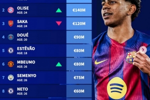 直播吧4月13日讯 德转更新了足坛右边锋身价情况,亚马尔以2亿欧居首,奥利塞以1.4亿欧位居次席。