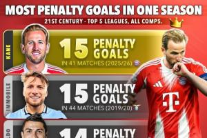 直播吧04月13日讯 Score90列出了本世纪单赛季点球进球榜,凯恩以15球与因莫比莱并列第一,C罗、梅西以14球并列第三。