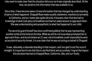 她对我们孩子遭遇的事情表示理解和同情,那位保安本人后来也公开确认,当时他是为另一位艺人在酒店工作,虽然我们仍然不知道是什么原因促使他去接近她们,而且我们也不认为一个正在吃早餐的11岁孩子能被视为任何形式的安全威胁,但现在可以明确的是,他并不是代表查普尔·罗恩行事的。