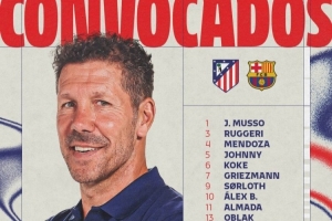 直播吧4月14日讯 北京时间明天凌晨,马竞将在欧冠1/4决赛次回合比赛中主场对阵巴萨,首回合马竞2-0取胜,马竞公布了此役的球员名单。吉梅内斯、汉茨科、普比尔、巴里奥斯缺席,卡尔多索、奥布拉克回归。