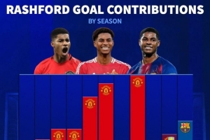 直播吧4月15日讯 巴萨将在本轮欧冠再战马竞,拉什福德的表现将至关重要,《转会市场》统计显示拉什福德本赛季直接参与进球数已可排在生涯第4位。