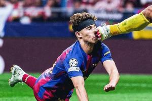 直播吧04月15日讯 欧冠1/4决赛次回合,马竞vs巴萨,第26分钟,费尔明头球攻门,随后被穆索踢到头部,倒地撞向地面,当场血崩!