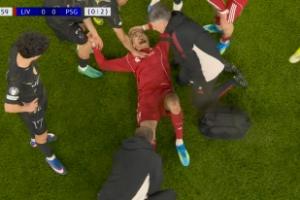 直播吧04月15日讯 欧冠8强次回合利物浦vs巴黎,埃基蒂克第29分钟无对抗受伤,被担架抬出场。萨拉赫登场!