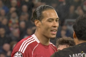 直播吧4月15日讯 利物浦vs巴黎上半场,范戴克门前补射被马尔基尼奥斯极限铲球封堵,起身后范戴克对同行点头称赞。