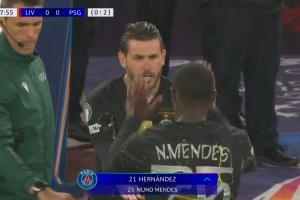 直播吧04月15日讯 利物浦vs巴黎第38分钟,门德斯伤退,卢卡斯·埃尔南德斯登场!