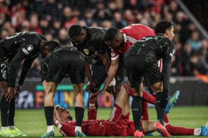 直播吧4月15日讯 欧冠1/4决赛次回合利物浦主场迎战巴黎,埃基蒂克上半场无对抗倒地,疑似遭遇跟腱重伤。