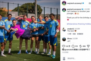 直播吧4月18日讯 巴萨门将什琴斯尼今日迎来36岁生日,球队在训练场上也摆出造型为其庆祝生日。