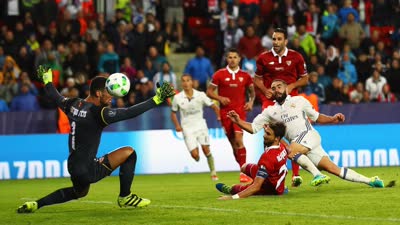 [滑门而过] 皇马边路精准传中 本泽马霸气头球滑门而过
